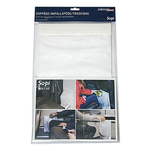 Vita soppåsar som passar perfekt på tåg, bussar och i kontorsmiljöer. Påsarna är blockade och fäst med en metallhållare. Enkelt att dra bort påsen när den är full. 50 stycken påsar per förpackning.