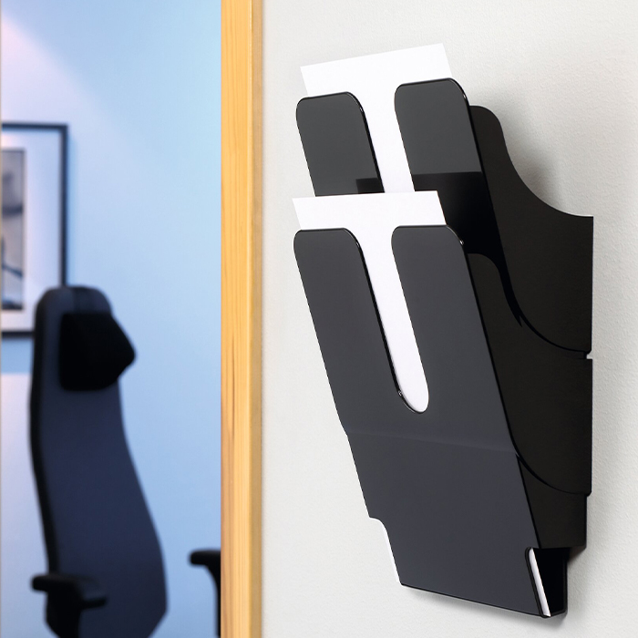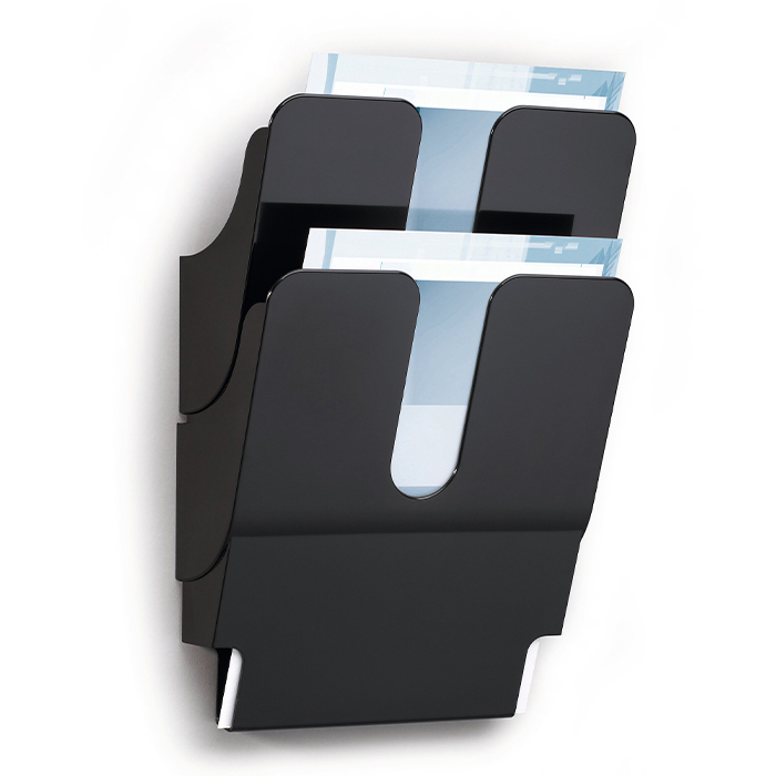Facken sätts lätt ihop och hur många som helst kan sättas i varandra efter behov. Hakas i varandra utan monteringsram och skruvas direkt på plats. Tillverkat av transparent polystyrenplast. A4 stående.
