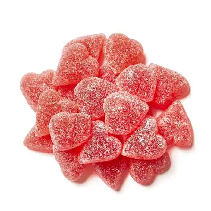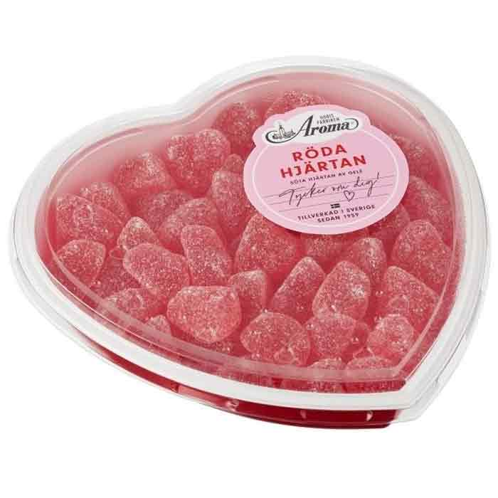 Härligt röda geléhjärtan i dekorativ ask. 385g. Ingredienser: Glukossirap, socker, gelatin, surhetsreglerande medel E330, stabiliseringsmedel E406, färgämnen E120, aromer.