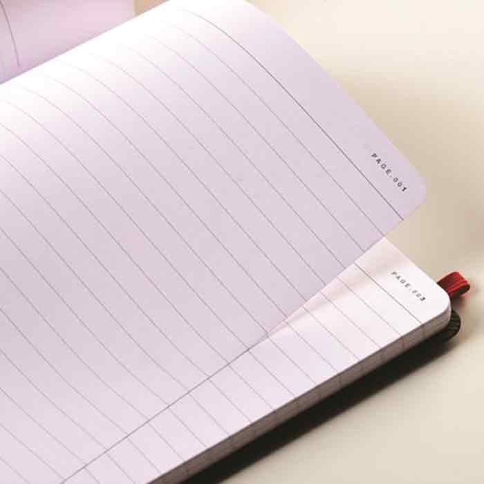 Med tåligt kartongomslag och gummibandsförslutning. Ficka för förvaring av kvitton, lösa lappar m.m. på baksidan.