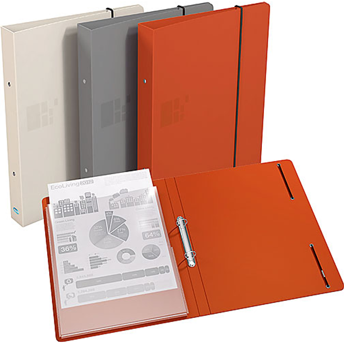 Flexibel ringpärm med extra breda sidor. På insidan finns en transparent ficka för smidig förvaring. Försluts med gummiband. Blandade färger: beige, grå och orange.