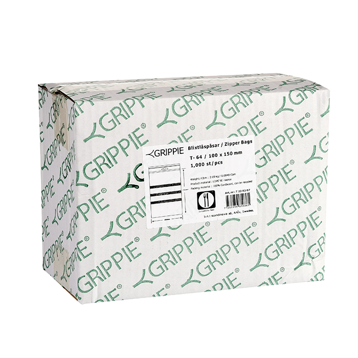 | Blixtlåspåse med skrivfält 100x150mm 90mic 1000st/fp 100x150mm | T230401 | 1 fp |