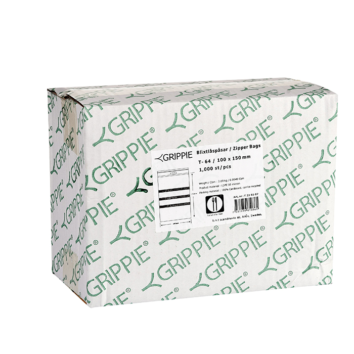 | Blixtlåspåse med skrivfält 100x150mm 90mic 1000st/fp 100x150mm | T230401 | 1 fp |