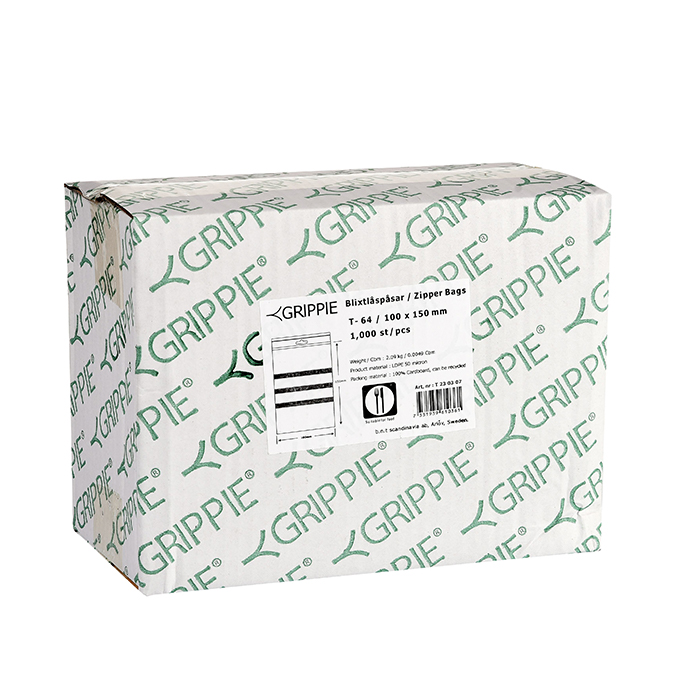 | Blixtlåspåse med skrivfält 100x150mm 90mic 1000st/fp 100x150mm | T230401 | 1 fp |