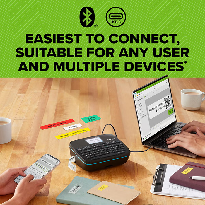 Med LabelManager® Executive 640 CB får du en portabel märkmaskin med högupplöst skärm, tydlig meny och ergonomiskt grepp för bekväm användning. Den fungerar med D1 Standard och Durable tejp i 6–24 mm och ansluts via Bluetooth® eller USB-C.