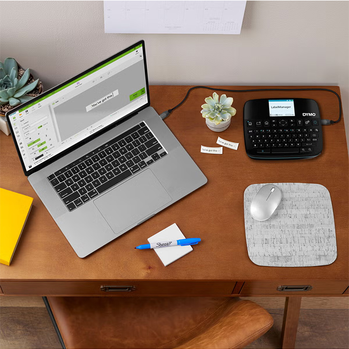 Det uppladdningsbara batteriet gör den perfekt för arbete på språng, och genom DYMO®s appar kan du spara och anpassa etiketter utan begränsning. Setet innehåller märkmaskin, tre tejpkassetter, batteri, USB-C-kabel och snabbstartsguide.