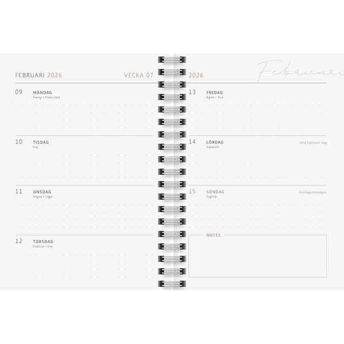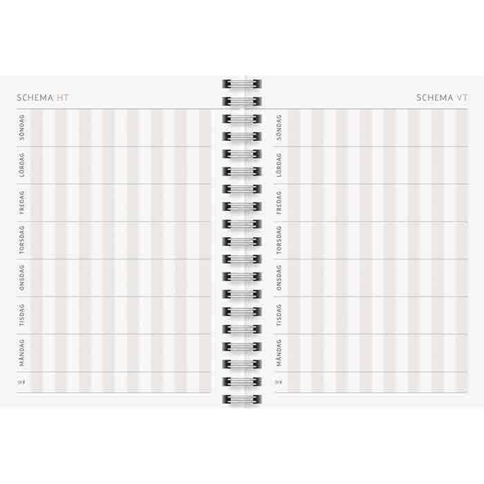 Spiralbunden kalender i smidigt A6-format med en vecka per uppslag. Den har både månads- och årsöversikt för innevarande och kommande år samt extra sidor för anteckningar. Linjal ingår för enkel planering i vardagen.