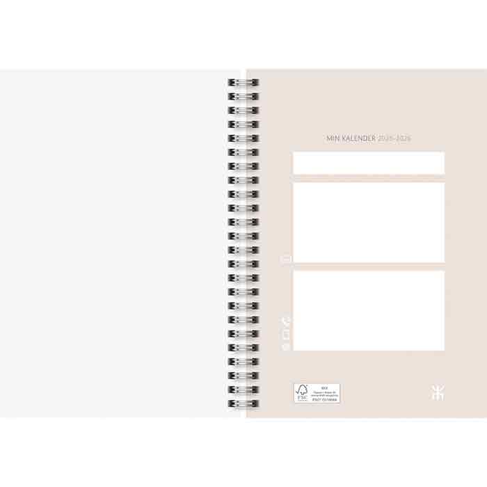 Kalender i A5-format med spiralbindning och tydlig veckovy. Försedd med månads- och årsöversikter för nuvarande och nästa år, tillsammans med anteckningssidor och linjal som underlättar vardagens planering.