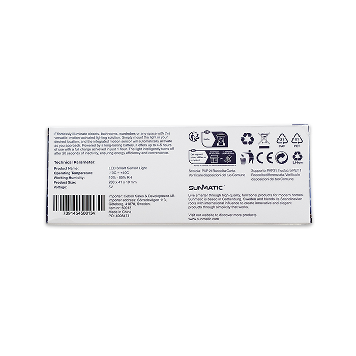 Med LED Sensor Light får du ett smart och stilrent sätt att lysa upp mindre utrymmen som garderober och klädkammare. Lampan reagerar på rörelse, tänds automatiskt när du närmar dig och stängs av efter kort tid, vilket sparar både energi och batteri. Den laddas snabbt på ungefär en timme och ger flera timmars användning. Ljuset kan ställas in i tre olika färgtemperaturer för att passa miljön, och den smala formen gör den enkel att montera där du behöver den. En praktisk och modern lösning för hemmet.