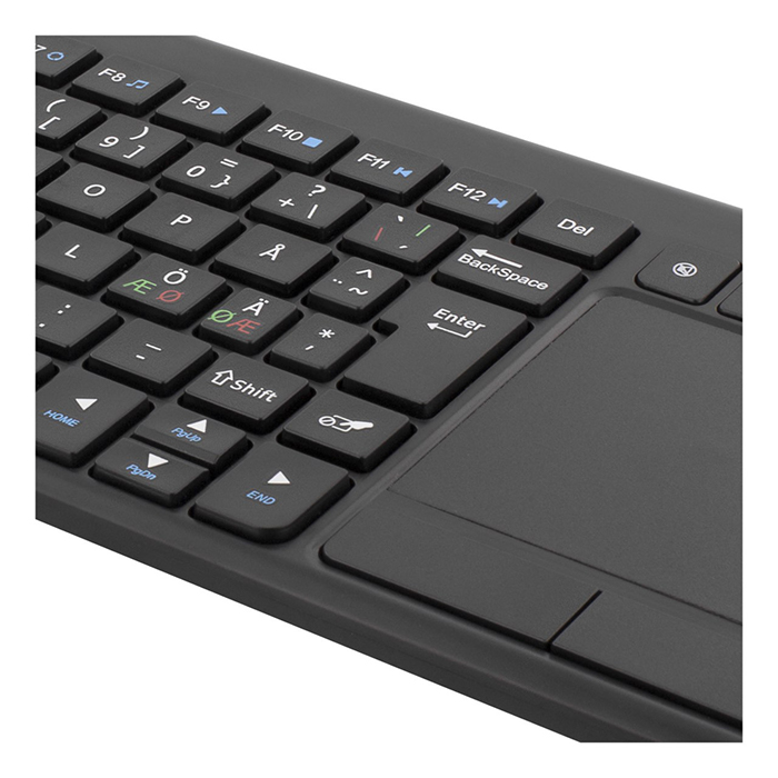 TB-504 är ett kompakt trådlöst minitangentbord med 86 tangenter, touchpad och nordisk layout. Det använder en 2,4 GHz nano-mottagare och är byggt för lång hållbarhet med fem miljoner tangenttryckningar. Tangentbordet har LED-indikatorer för Caps Lock, lågt batteri och aktiv anslutning.