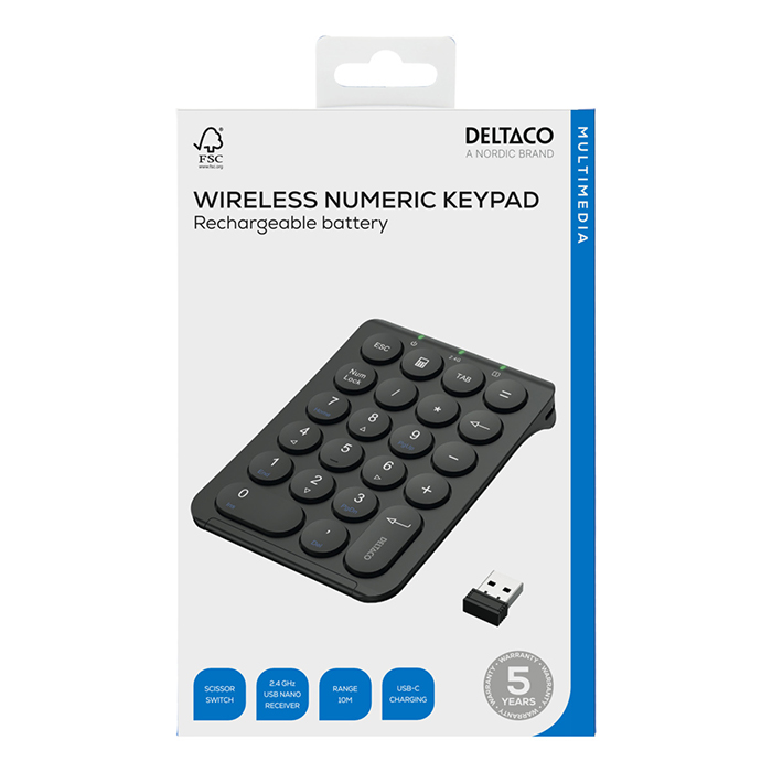Detta numeriska tangentbord på 2.4GHz är perfekt för dig som vill ha en enkel och effektiv sifferdel vid sidan av datorn. Med 22 tangenter och sköna sax-brytare får du snabb och exakt inmatning, och funktioner som ESC, TAB och kalkylatorknapp gör arbetet smidigt. Den trådlösa anslutningen har en räckvidd på omkring tio meter och det inbyggda batteriet håller upp till fyrtio timmar per laddning. Laddning sker via USB MicroB och den eleganta svarta designen gör det lätt att kombinera med resten av din utrustning.