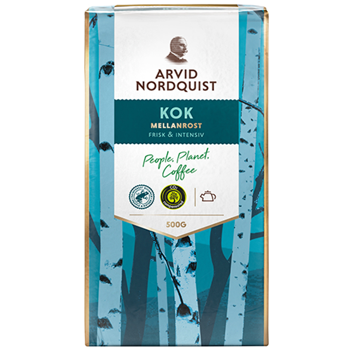 Kok från Arvid Nordquist är ett mellanrostat kokkaffe som bjuder på en fyllig, nötig smak och en frisk citrusbetonad avslutning. Det är gjort på högkvalitativa arabicabönor, är Rainforest Alliance-certifierat och rostas utan fossila bränslen. Tillredningen är enkel: dosera kaffet direkt i kannan, fyll på med kallt vatten, koka upp, ta av från värmen och låt stå fyra till sex minuter efter omrörning. 12st förpackningar á 500g.