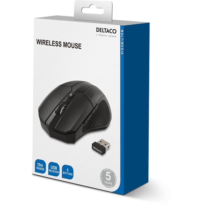 Denna trådlösa optiska mus kombinerar komfort och funktion i en stilren svart design. Med sju knappar och justerbar DPI får du god kontroll oavsett arbetsuppgift. Den ergonomiska formen ligger bra i handen och den trådlösa anslutningen via USB nano-mottagare ger snabb och pålitlig uppkoppling.