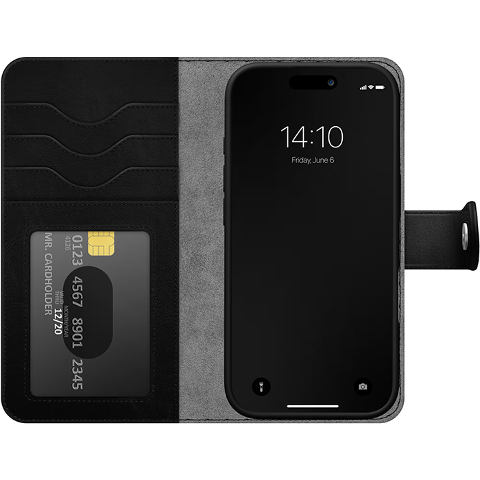 Mobilfodral i plånboksmodell utrustat med sex kortplatser för smidig förvaring av kort tillsammans med telefonen. Den magnetiska stängningen håller fodralet ordentligt stängt när det inte används. Invändigt finns ett mjukt foder som bidrar till att skydda displayen, samt ett löstagbart eller fast integrerat innerskal som ger stabilitet och skydd runt enheten.