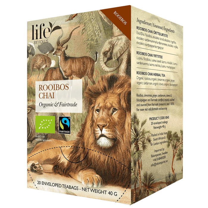 Rooibos Chai från Life by Follis är ett ekologiskt örtte med Fairtrade-certifierade ingredienser. Basen av sydafrikansk rooibos ger en naturligt koffeinfri och lätt söt smak, kombinerad med en kryddblandning av kanel, ingefära, kardemumma, nejlika och svartpeppar som ger en fyllig och varm karaktär.