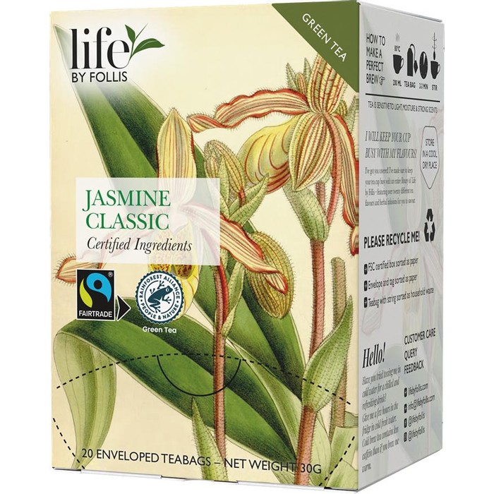 Jasmin från Life by Follis är ett grönt te med bas av Ceylonte och tillsats av äkta jasminblommor. Smaken är frisk och balanserad med en tydlig blommig ton som ger en mjuk och harmonisk kopp.