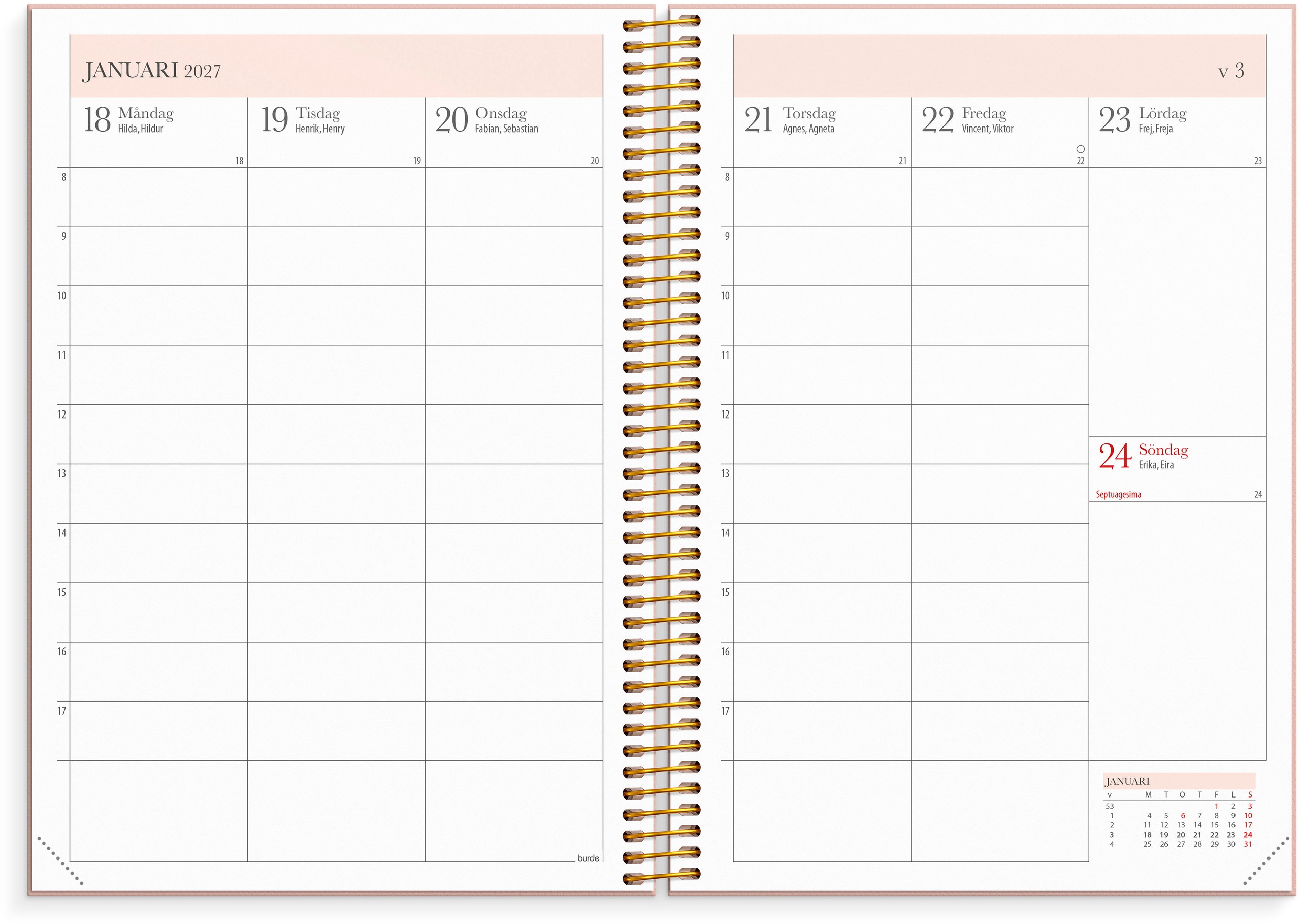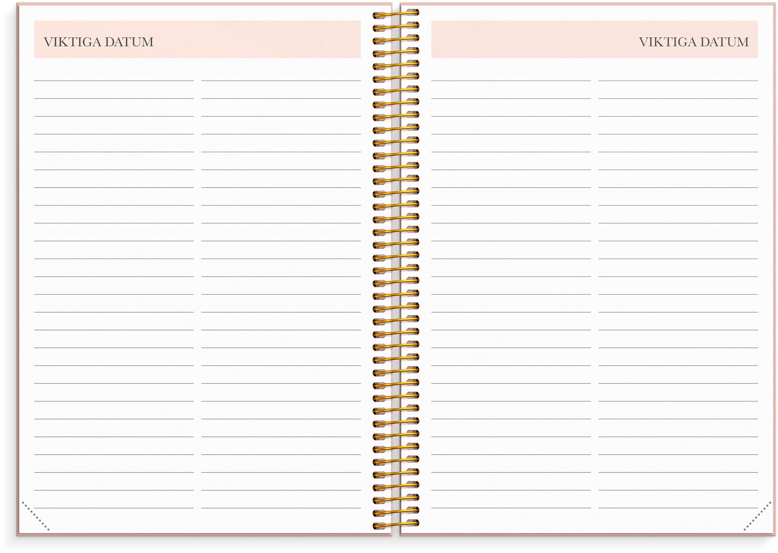 Innehåll: Kyrkliga helgdagar, flaggdagar, helgdagar/aftnar, viktiga datum, månfaser, namnsdagar, temadagar/händelser, årsöversikt/årsöversikter, årsplan/årsplaner, kontaktlista, schema.