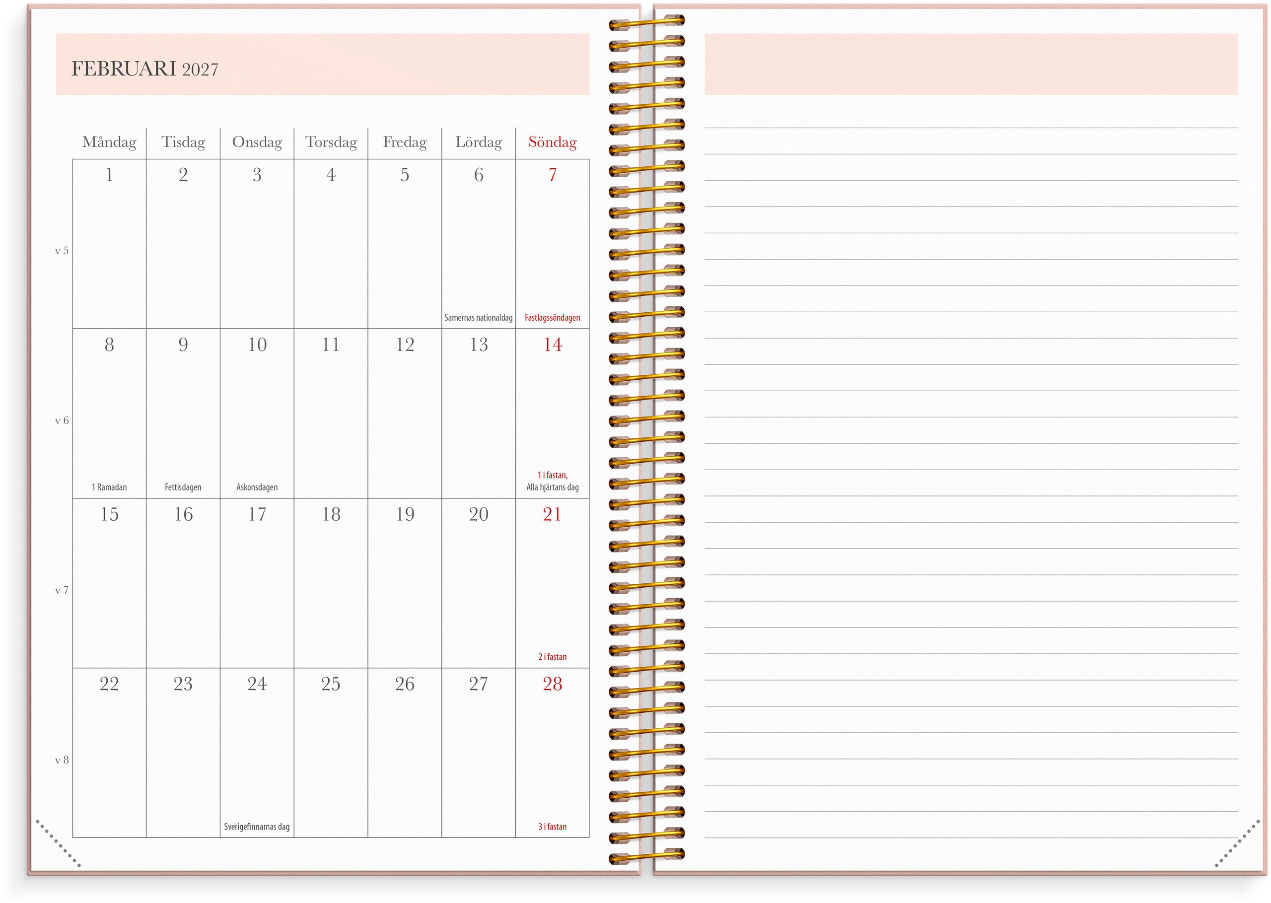 Detaljer: Spiralbunden. Gummiband. Flyttbara plastmarkörer. Pappersficka.