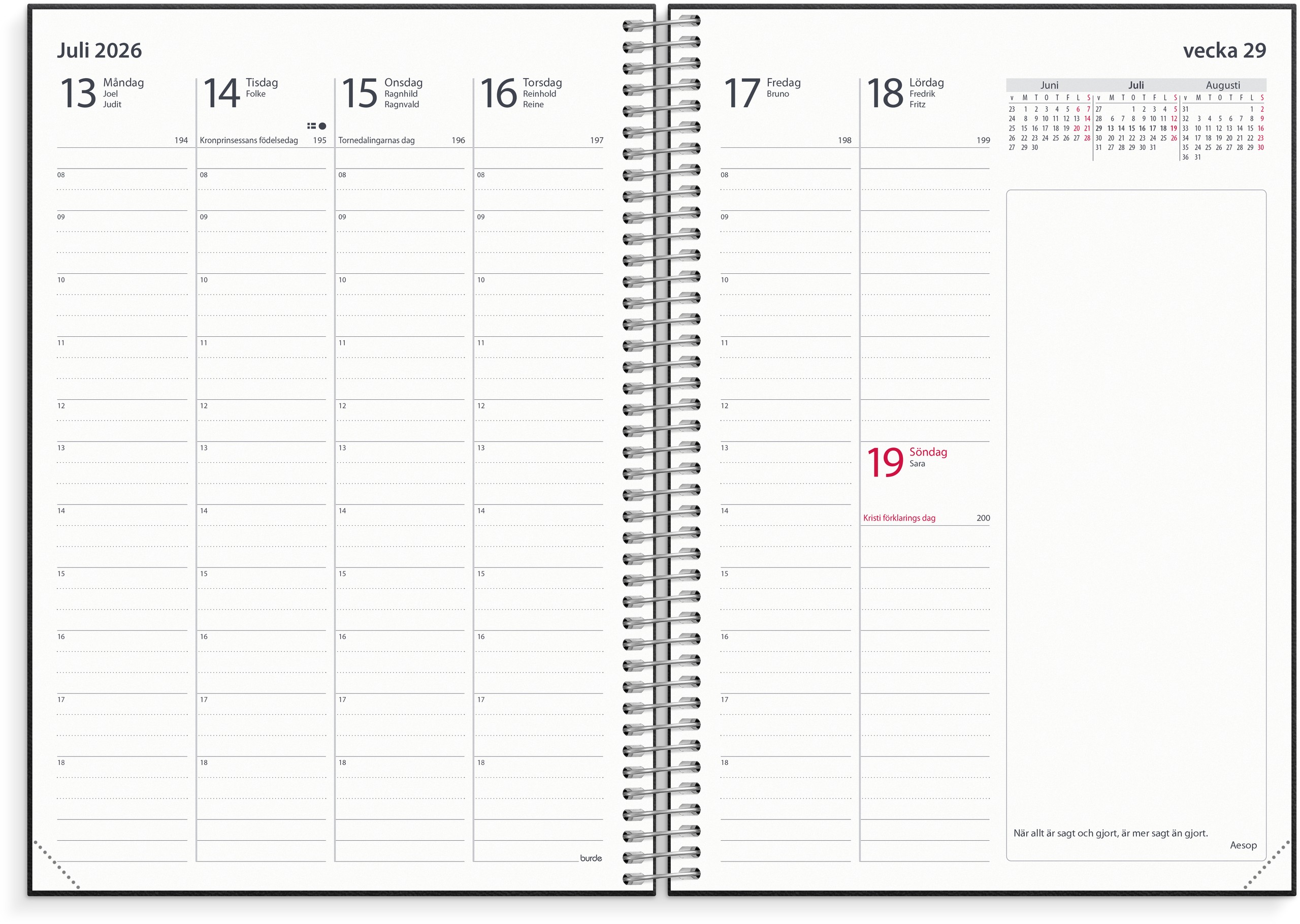 Innehåll: Kyrkliga helgdagar, flaggdagar, helgdagar/aftnar, månfaser, namnsdagar, temadagar/händelser, årsplan/årsplaner, kontaktlista, schema, elevfrånvaro, elevförteckning.