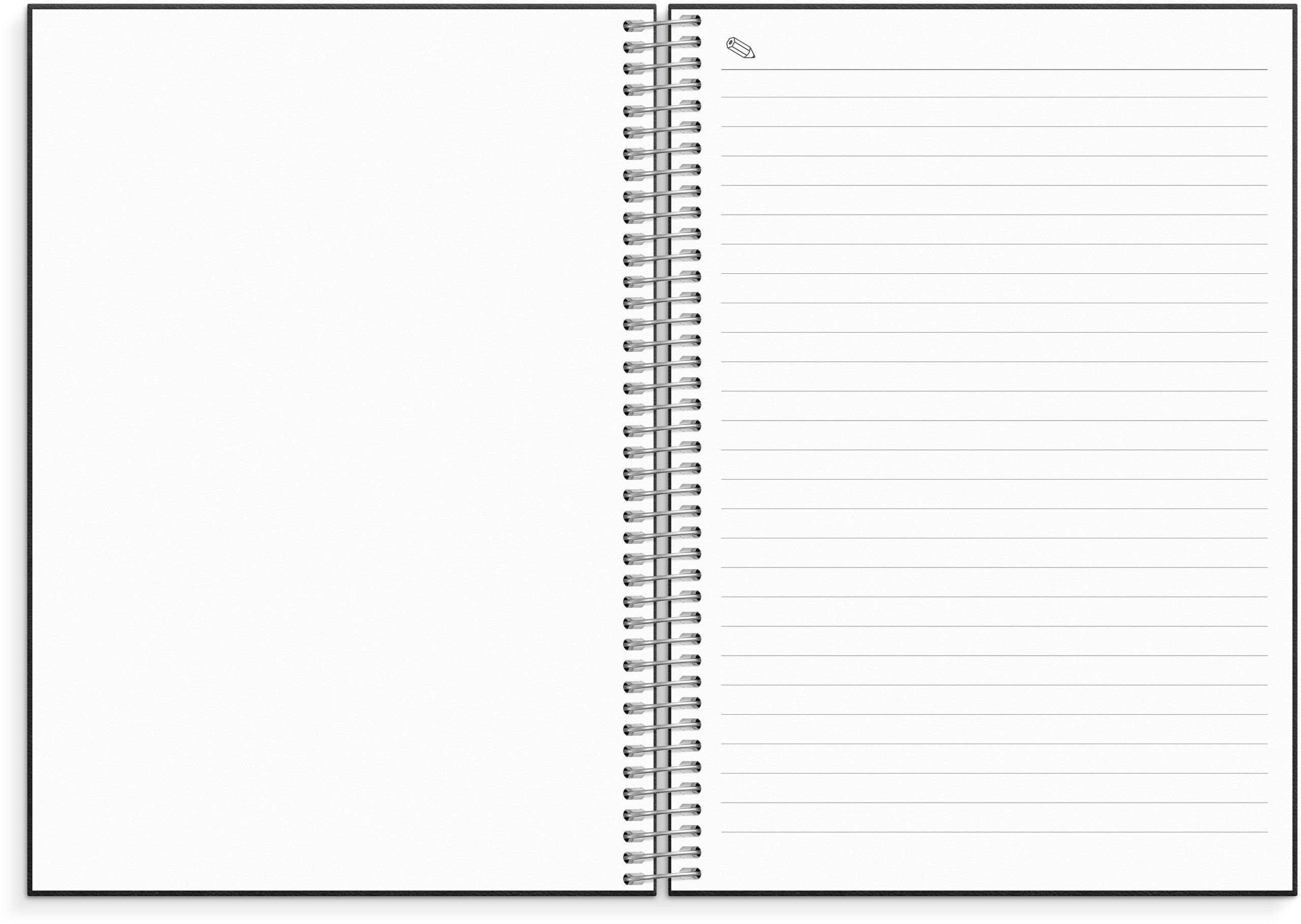 Detaljer: Spiralbunden. Gummiband. Flyttbar plastlinjal. Pappersficka. Pappersficka.