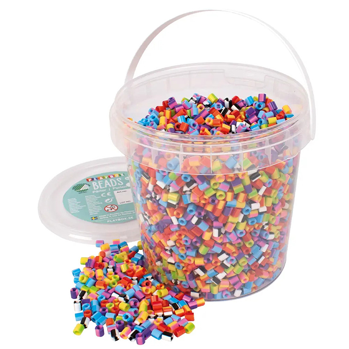 Pärlorna kan även användas till smyckestillverkning eller andra typer av dekoration. Förpackade i en hink som ger smidig förvaring och enkel hantering vid pyssel i hem, skola eller verksamhet.