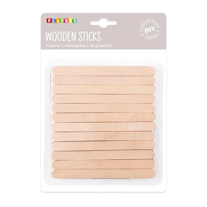 Glasspinnar i trä, framtagna för hobbyarbete och skapande. De har en jämn yta som gör dem enkla att måla och dekorera. Pinnarna kan användas för att bygga enklare konstruktioner som hus och figurer.