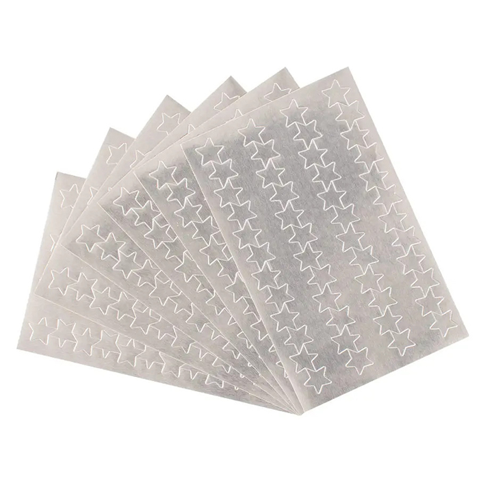 Självhäftande silverstjärnor i mindre format, framtagna för pyssel och dekoration. Den blanka ytan ger en tydlig effekt som framhäver detaljer i olika projekt. Kan användas till exempelvis gratulationskort, scrapbooking och dekorativa inslag vid högtider.