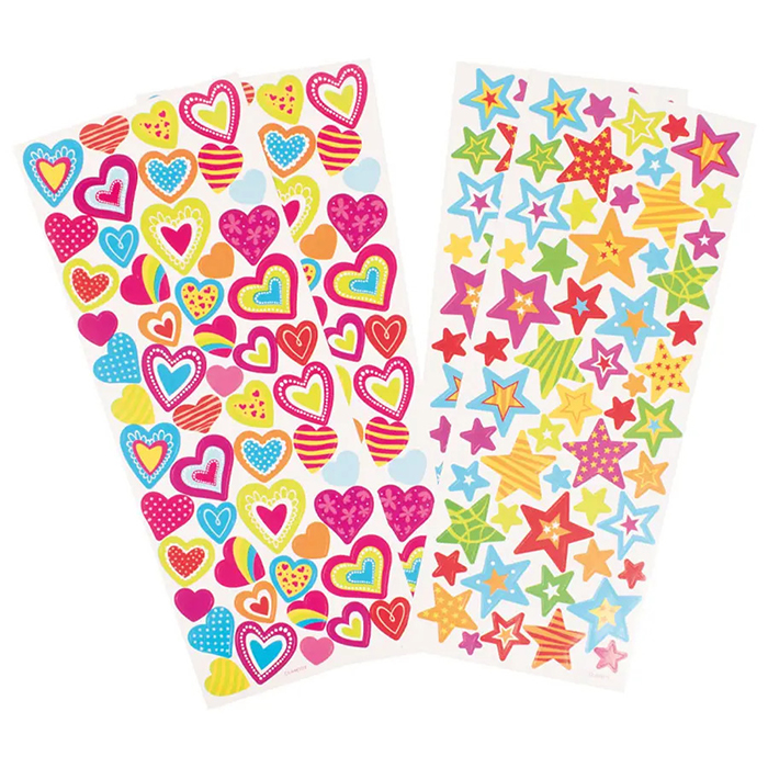 Dekorationsstickers med hjärt- och stjärnmotiv i blandade färger. Utformningen gör dem användbara i olika typer av kreativa projekt.