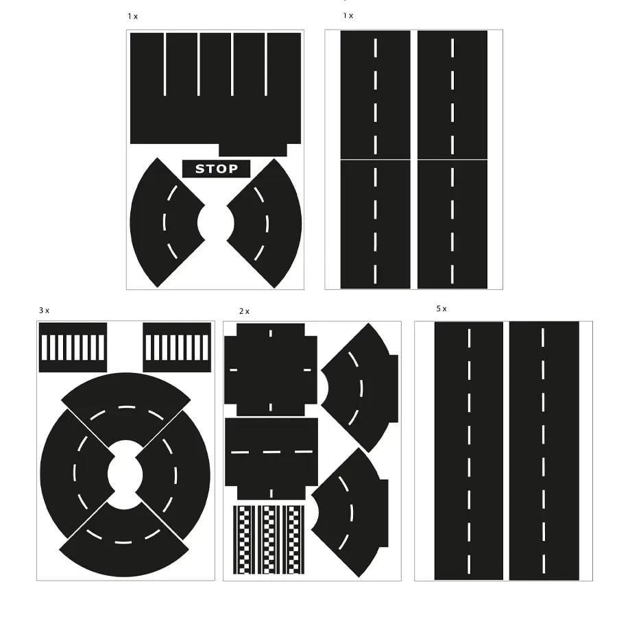 Stickers Kurvor & Korsningar från Playbox innehåller 50 dekaler med olika vägdelar, framtagna för att komplettera raka vägremsor.